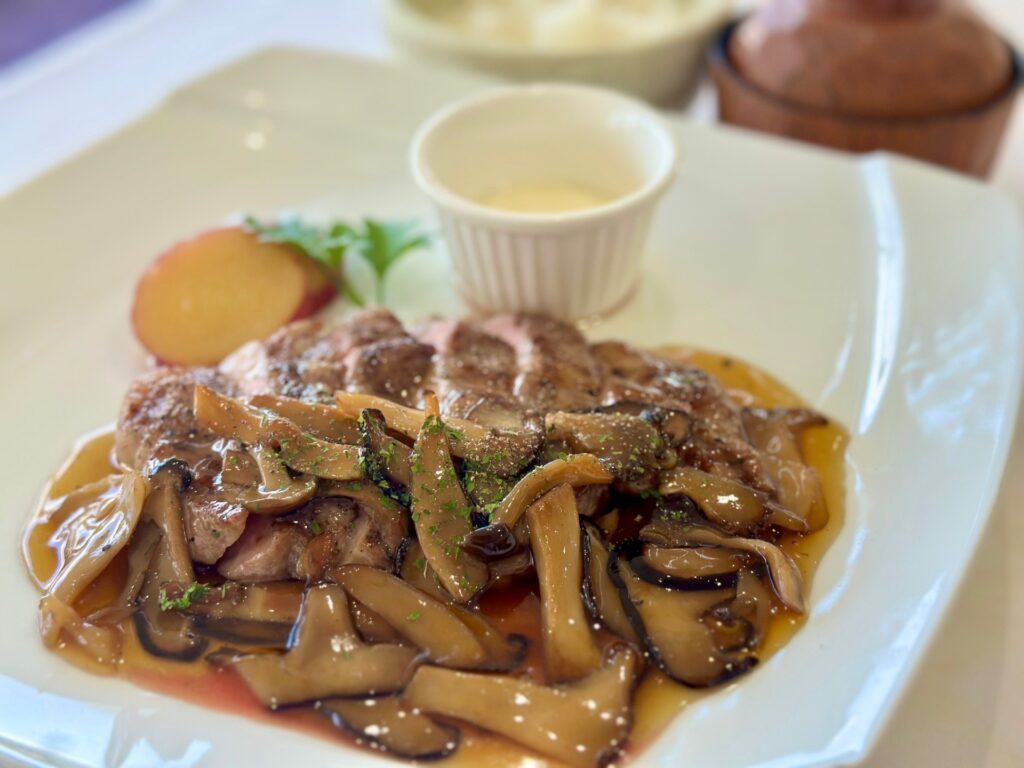 ジューシーな豚ロースに4種のきのこを使用した和風ソースをあわせました。