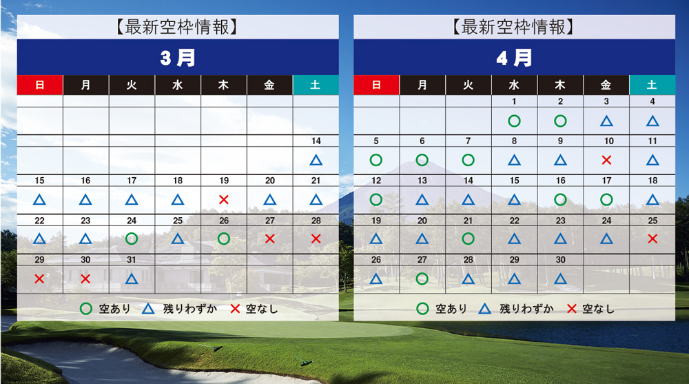 お知らせ 鳴沢ゴルフ倶楽部 お知らせ ★最新空き枠情報★ ★最新空き枠情報★ 2026.02.22 最新空き枠情報のご案内です! まだまだご予約可能な日多数ございます。 よろしければご家族・ご友人などお誘いあわせの上 ご予約お待ちしております。 現在、お得な乗用カート(電磁誘導式)導入を記念しまして【先行予約】特別優待プランを 公開しております。 ご予約はこちらから 一覧に戻る