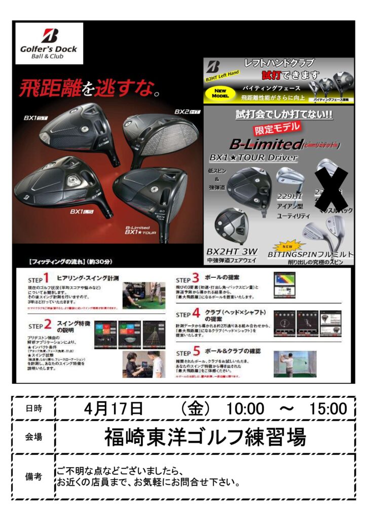 イベント情報 福崎東洋ゴルフ練習場 イベント情報 ブリヂストン試打会 ブリヂストン試打会 2026.02.27 開催日時 2026年月4月17日(金) 10:00~15:00 ブリヂストンの試打会を開催します。 レディース、レフティ、試打会限定モデルの試打クラブをお試しいただけます。 ご来場お待ちしております。 一覧に戻る