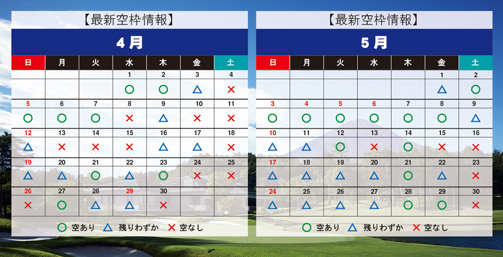 お知らせ 鳴沢ゴルフ倶楽部 お知らせ ★最新空き枠情報★ ★最新空き枠情報★ 2026.03.08 最新空き枠情報のご案内です! まだまだご予約可能な日多数ございます。 よろしければご家族・ご友人などお誘いあわせの上 ご予約お待ちしております。 現在、お得な乗用カート(電磁誘導式)導入を記念しまして【先行予約】特別優待プランを 公開しております。 ご予約はこちらから 一覧に戻る
