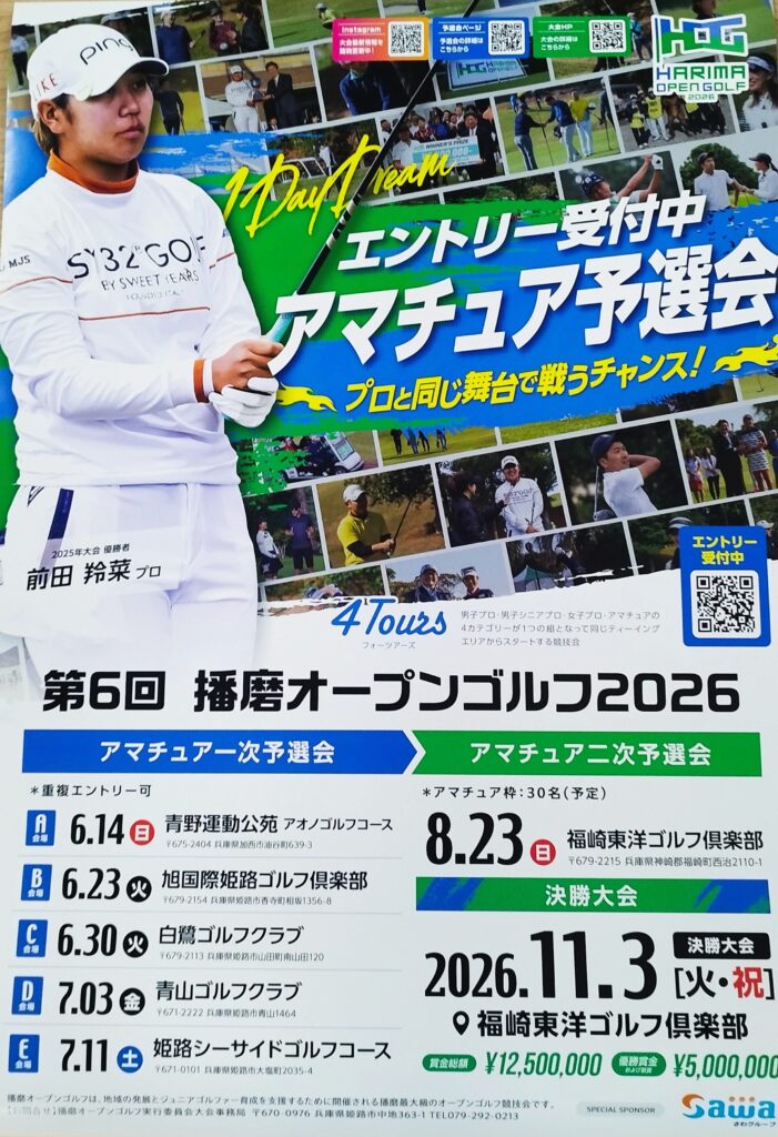 イベント情報 福崎東洋ゴルフ俱楽部 イベント情報 第6回播磨オープンゴルフ開催 第6回播磨オープンゴルフ開催 2026.04.27 2026年11月2日(月)3日(祝)に開催いたします。 ※大会期間中は一般のエントリーは出来ません。 ご理解、ご協力の程よろしくお願いいたします。 播磨オープンゴルフ公式HP 一覧に戻る