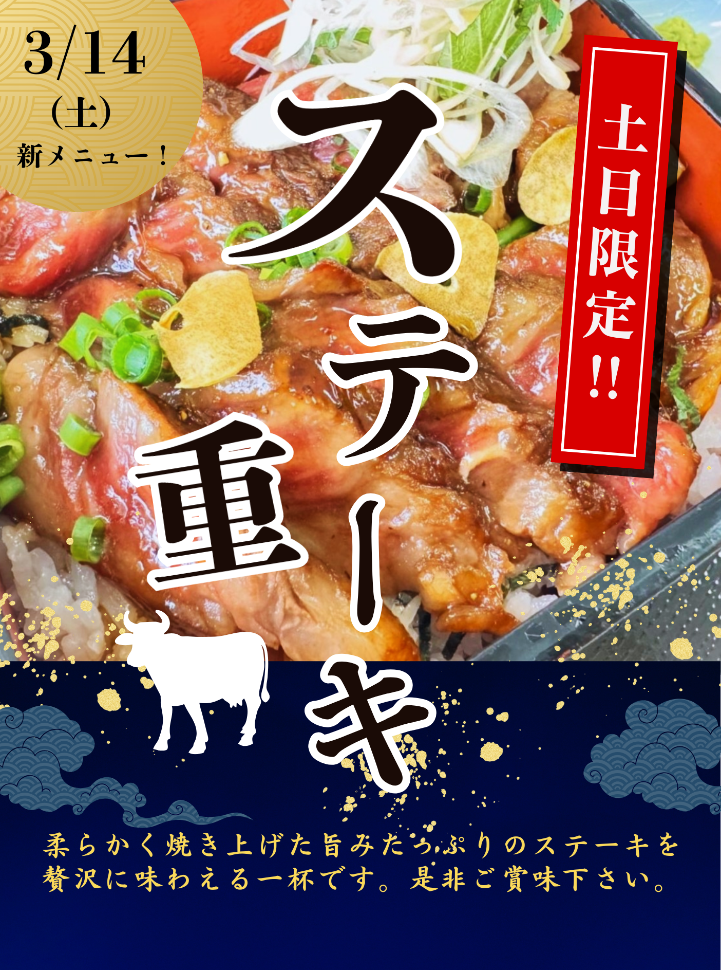 本日3/14(土)より、【土日限定】でステーキ重が登場‼✨ 既に大好評のメニ...