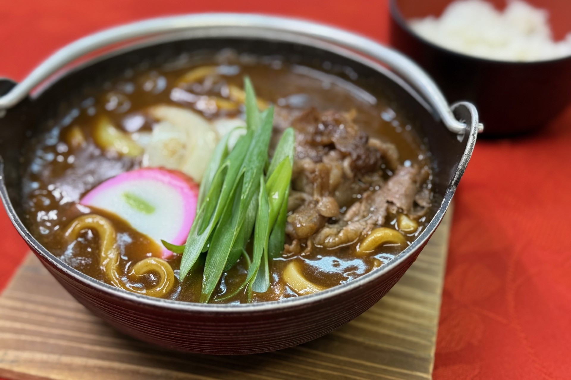 鉄鍋で熱々に仕上げた、シンプルなカレーうどんの登場です。